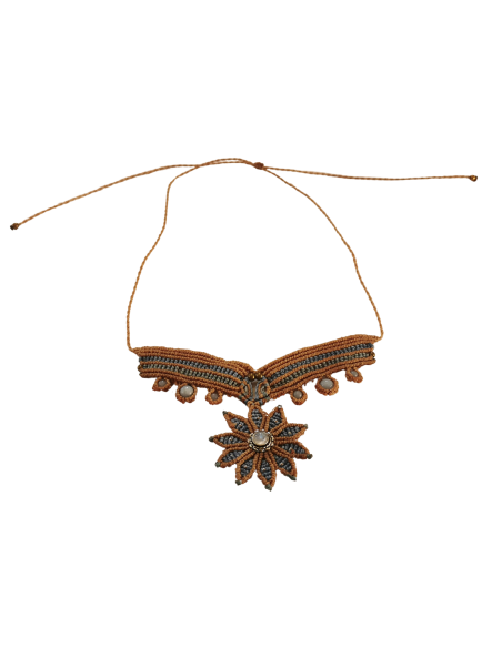 Couleurs : marron, bleu ciel, perles grises, pierre bleu ciel OU orange, vert, perles dorées, pierre orange