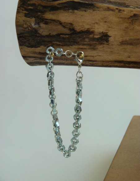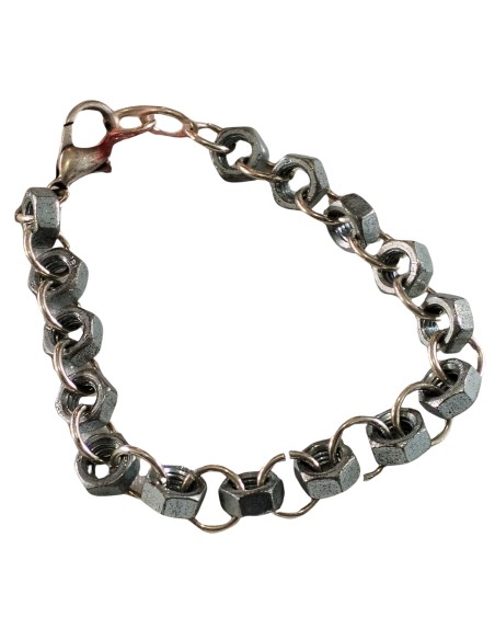 Bijoux artisanal conçu à la main : écrous argentés, anneaux et attache argentés.